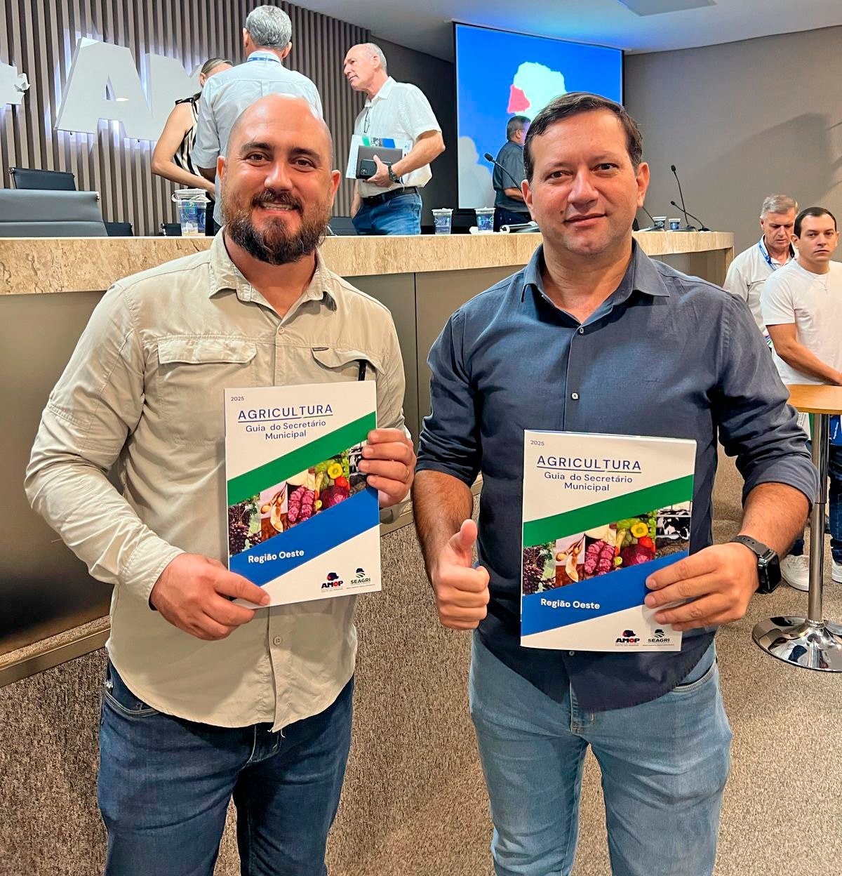 Secretário de Agricultura e Meio Ambiente Alisson Chirea e o Prefeito Valdir Zielinski recebendo o Guia do Secretário da Agricultura em reunião na AMOP